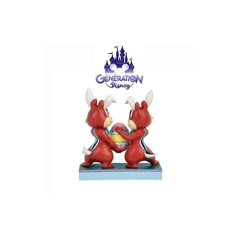 Avec des oreilles de lapin, des nœuds papillon et des motifs traditionnels colorés de Jim Shore, le duo porte un grand œuf de Pâques avec un large sourire et un enthousiasme sans faille.