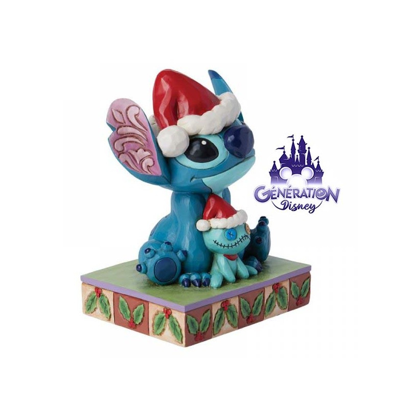 Stitch et son petit ami Scrump sont prêts à accueillir le Père Noël avec leurs bonnets de fête. Le complément parfait à toute exposition de Noël de Disney Traditions.