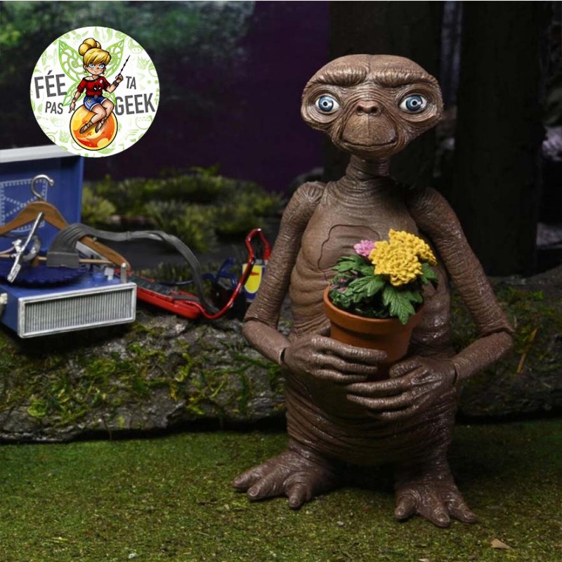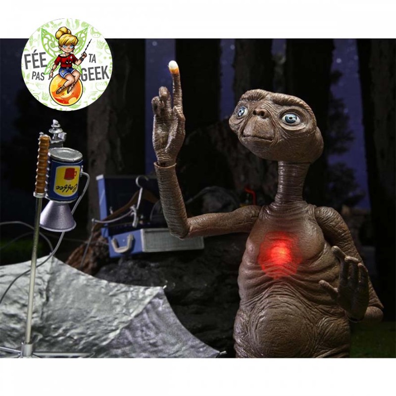 Cette figurine Ultimate Deluxe comprend un coffre lumineux à LED, comme dans le film ! Elle est accompagnée du grand dispositif de communication intégré au film pour ""Téléphoner à la maison"", d'une plante en pot et de cous et mains interchangeables. E.T. mesure 17,78 cm de hauteur et est articulé. Livré dans un emballage vitrine. Piles incluses.