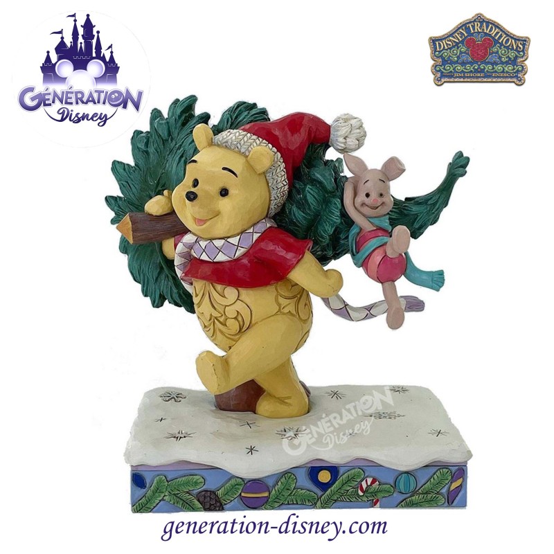 Dans cette charmante scène de Jim Shore, Winnie l'Ourson arbore des rosaces complexes et un chapeau de Père Noël orné de houx, alors qu'il ramène joyeusement un sapin de Noël à la maison avec Porcinet. Ils marchent dans la neige sur une scène festive d'ornements.Chaque figurine est en résine et peinte à la main, fournie dans une boîte cadeau.