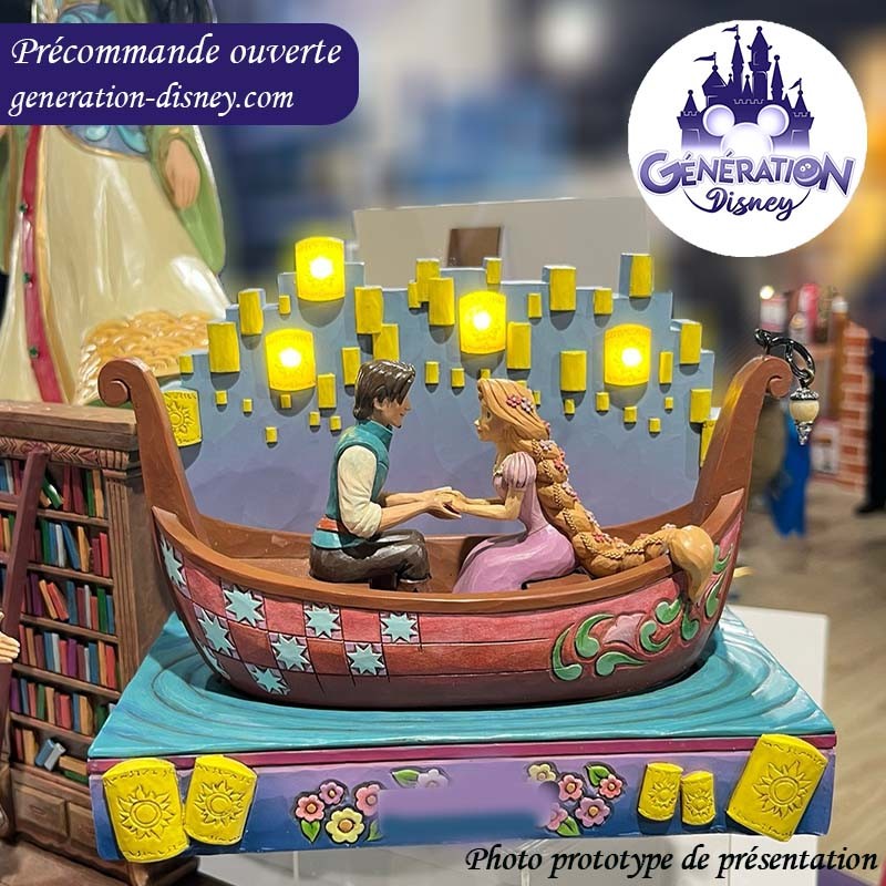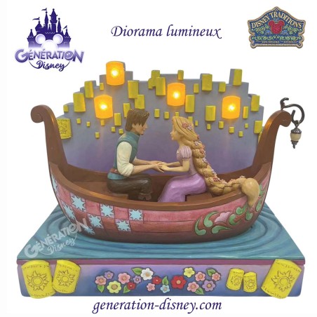 Dans ce magnifique dessin de Jim Shore, Raiponce et Flynn Rider font une promenade romantique en bateau à travers des lanternes flottantes à diodes électroluminescentes. Pour capturer l'enchantement, le charme de Raiponce brille avec des fleurs dans ses cheveux. Le bateau présente les détails emblématiques de Jim Shore.