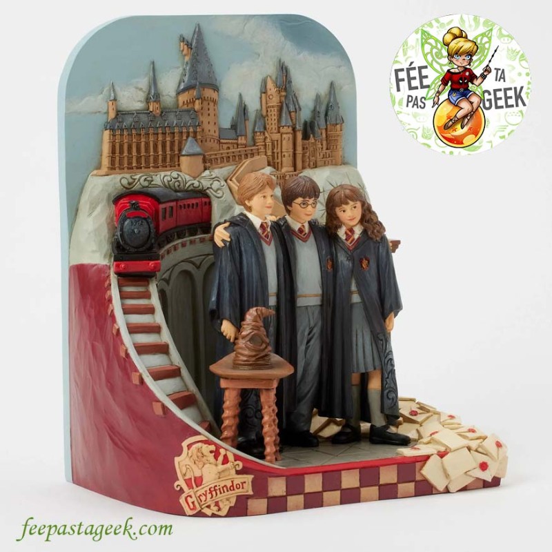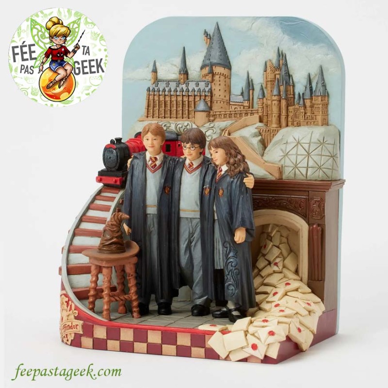 Diorama de Harry Potter et ses 2 amis Ron Weasley et Hermione Granger, posant devant l'école des sorciers Poudlard "Hogwart", avec le Choixpeau et le Poudlard Express, emblèmes de cette œuvre.