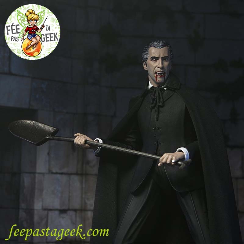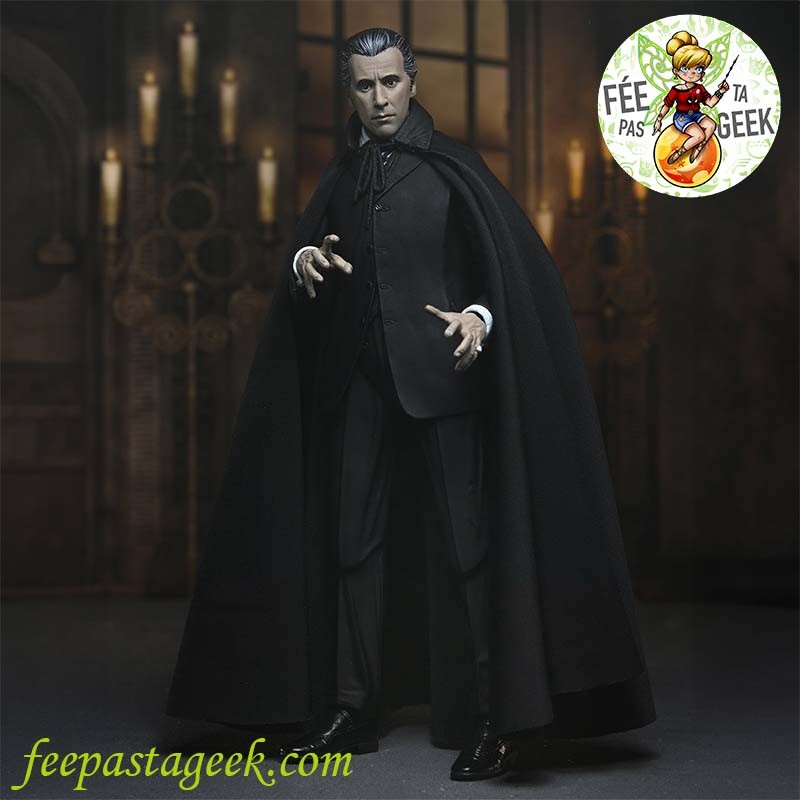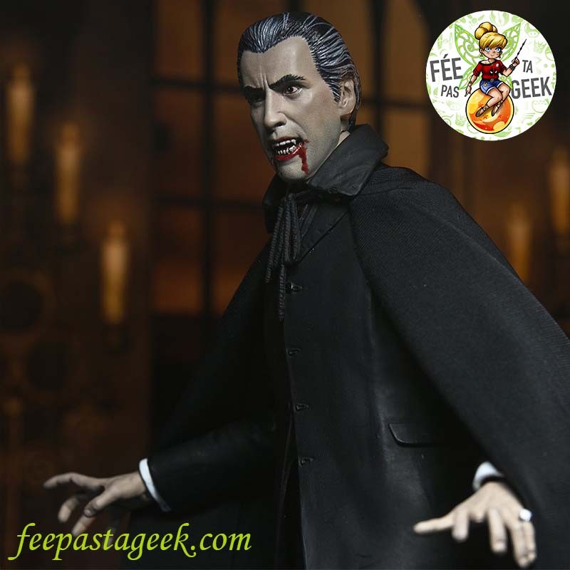 Figurine articulée en pvc et avec vêtements tissu, représentant le Conte Dracula joué par Christopher Lee, dans le classique de 1958 réalisé par Terence Fisher, produit par les Studios Hammer : Le cauchemar de Dracula.
