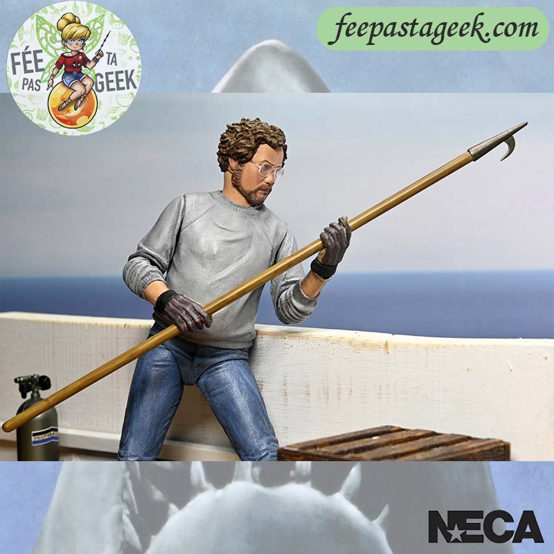 Le capitaine têtu de l'Orca chasse le requin jusqu'à ce que son orgueil le conduise à une mort sanglante. À l'échelle 18 cm, la figurine comprend plusieurs têtes, mains et bras interchangeables pour un look différent. Elle possède également des mains gantées, une machette, une canette, une canette écrasée, un fusil et un harpon.