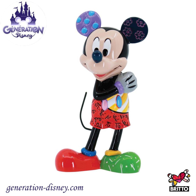 L'artiste pop Romero Britto réinterprète Mickey Mouse dans sa palette de couleurs vives et joyeuses, emblématique de son style. Fabriquée en pierre reconstituée, cette figurine est peinte à la main, ce qui peut entraîner des variations uniques.