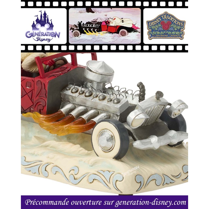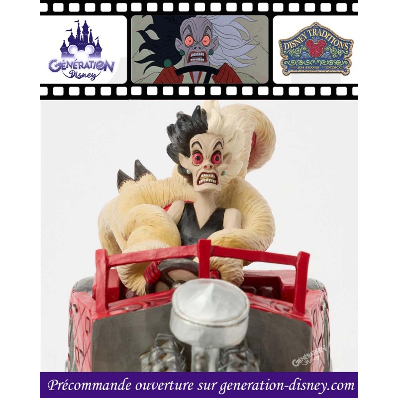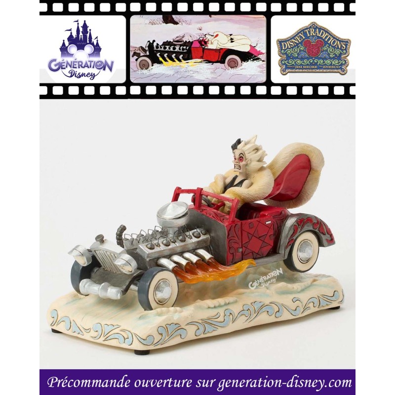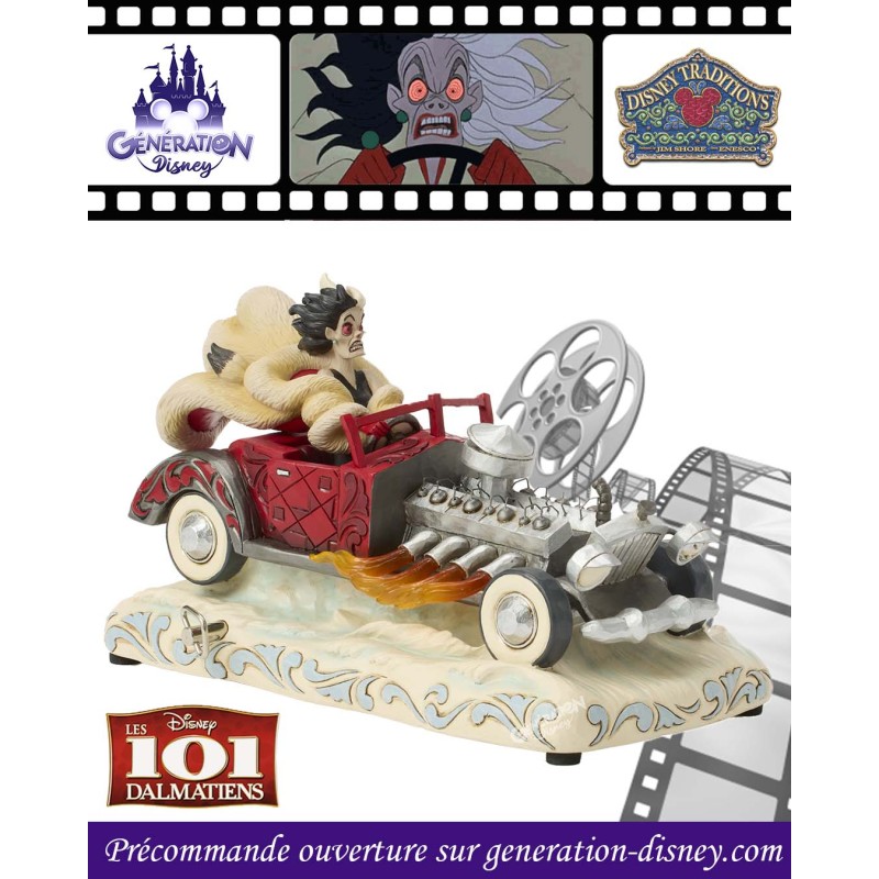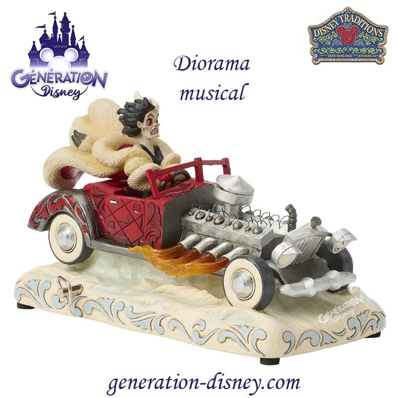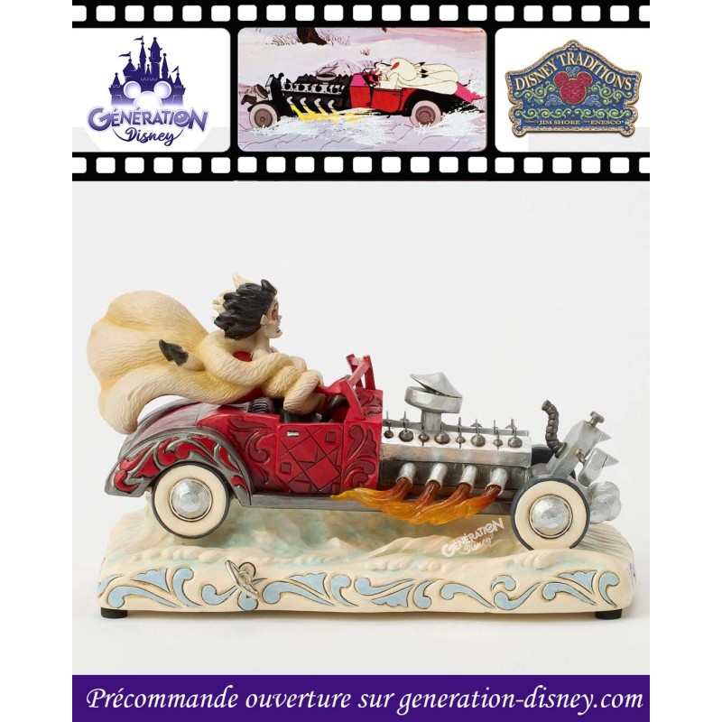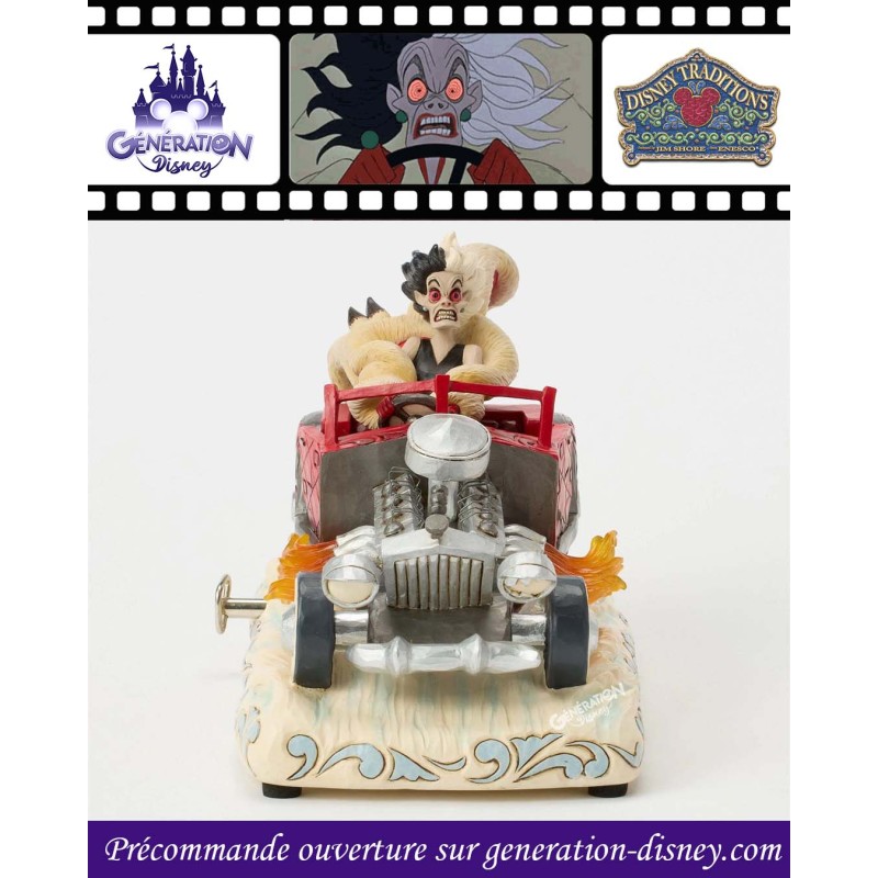 À l'occasion du 65e anniversaire des 101 Dalmatiens, Jim Shore capture Cruella Denfer dans sa voiture rouge ornée de rosemaling. Des flammes jaillissent du moteur, tandis que ses cheveux sauvages et son manteau de fourrure s'envolent au rythme de sa mélodie fétiche.
