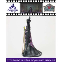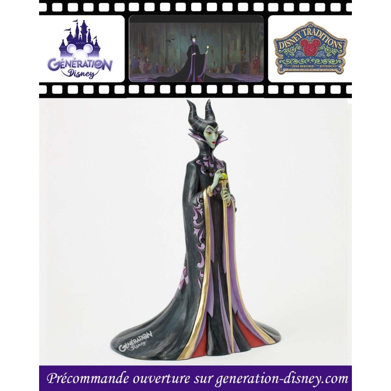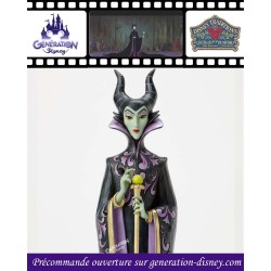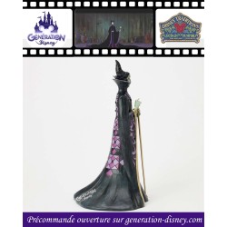 Ce dessin de Jim Shore représente la méchante Maléfique dans sa cape noire et violette ornée des motifs de courtepointe et de rosace de Shore. Le regard sinistre, elle tape sur son bâton, canalisant la magie noire avec la malice au cœur.