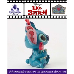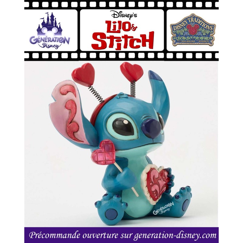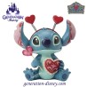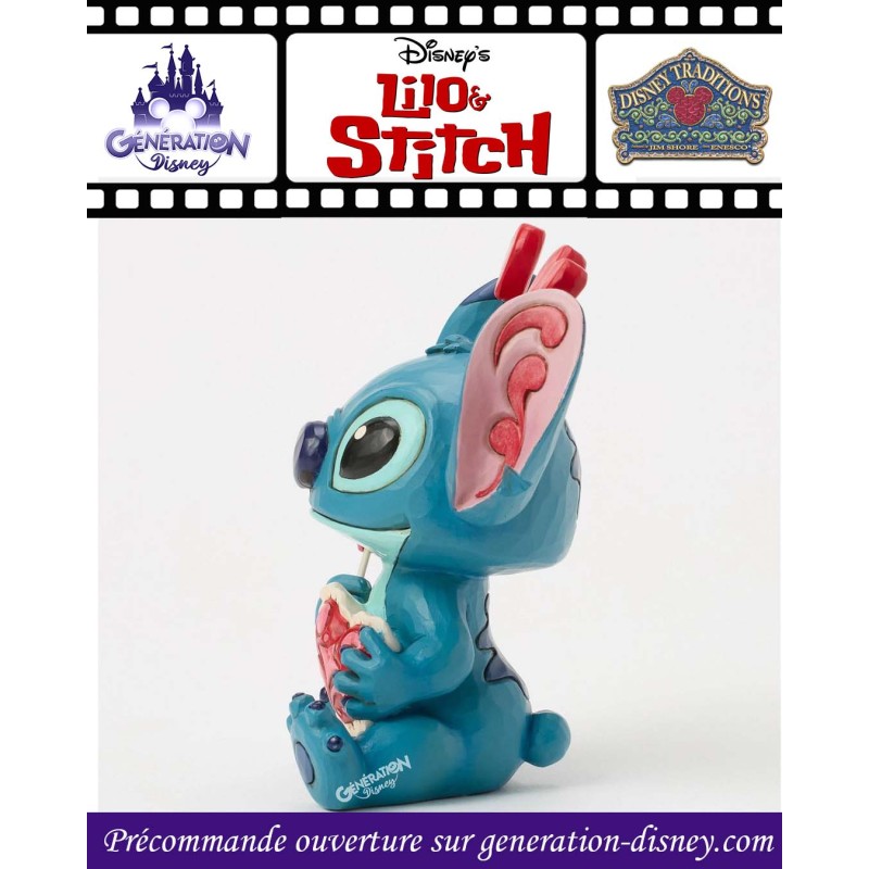 Stitch est très mignon dans cette création de Jim Shore. Il porte un bandeau en forme de cœur et tient une sucette en forme de cœur. Un cœur matelassé aux motifs complexes repose dans son autre main, tandis que des détails en forme de rose ornent ses oreilles.