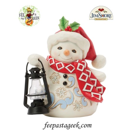 Ce charmant bonhomme de neige miniature de Jim Shore porte une lanterne dans sa main. Vêtu d’un chapeau de Père Noël orné de houx et d’une écharpe à motifs, il incarne parfaitement l'esprit chaleureux des fêtes.