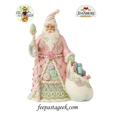 Cette charmante figurine du Père Noël de la collection Heartwood Sweets, créé par Jim Shore, arbore de jolis tons pastel de rose et de vert, décorés de bonbons. Tenant une canne et un sac de douceurs, son chapeau rappelle une glace tourbillonnante, tandis que sa cape est ornée de motifs de l'artiste.