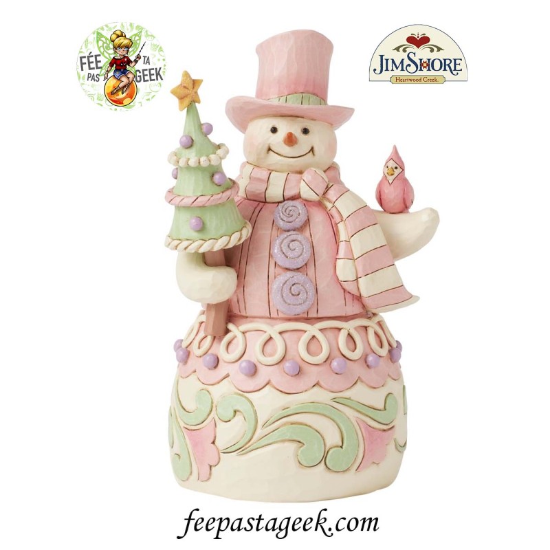 Ce bonhomme de neige en pastel rose de la collection Heartwood Sweets, conçu par Jim Shore, est plein de charme avec ses motifs délicats, ses paillettes et ses détails, reflétant l'esprit des fêtes. Il tient affectueusement un arbre décoré et un cardinal.