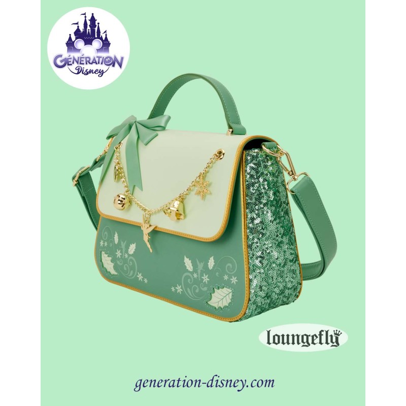 Ce sac à bandoulière s'inspire de la fée Clochette de Disney ! Il est orné de paillettes sur les côtés. Le devant présente des motifs en relief, des feuilles, un nœud en satin et des breloques métalliques représentant une serrure, une clochette, la fée Clochette, un dé à coudre et une étoile ! C'est un accessoire élégant et festif qui s'accordera avec toutes vos tenues cette saison !