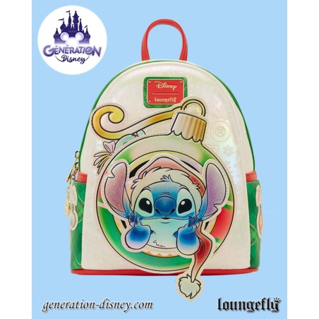 Ce mini sac à dos est prêt à célébrer les fêtes ! Vous trouverez Stitch qui jette un œil depuis une décoration sur la poche avant. Scrump s'accroche au crochet de la décoration et peut bouger d'avant en arrière ! Sur le reste du sac, vous trouverez des motifs décoratifs sur un fond nacré. Les bretelles à carreaux complètent le look !