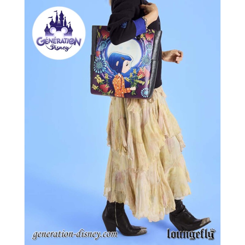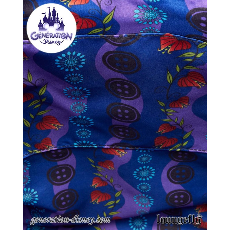 Ce sac fourre-tout est parfait pour le travail ou les loisirs. Vous trouverez Coraline au centre, entourée de détails floraux et d'un bouton en forme de lune lumineuse (oui, il brille dans le noir !). Des boutons et des fils en relief apparaissent sur les côtés du sac pour une touche effrayante supplémentaire.