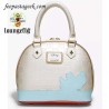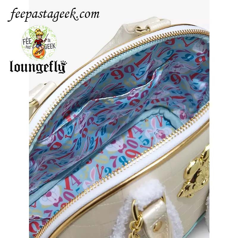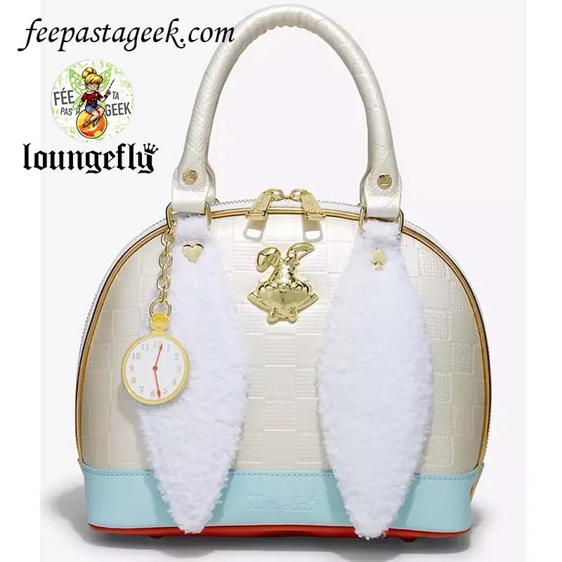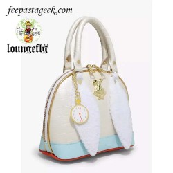 Ce sac à main s'inspire du Lapin blanc du film Alice au pays des merveilles de Disney. Il est entièrement recouvert d'un motif à carreaux blancs et gris. Une bande bleue sur le bas du sac porte l'inscription « I'm Late » (Je suis en retard). Un charm en métal moulé en 3D représentant le lapin est apposé sur un côté, tandis qu'une applique bleue le représentant avec des détails en relief se trouve à l'arrière. Deux appliques en sherpa descendent de la poignée supérieure et ressemblent à des oreilles de lapin ! Vous trouverez également un charm en forme d'horloge !
