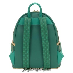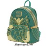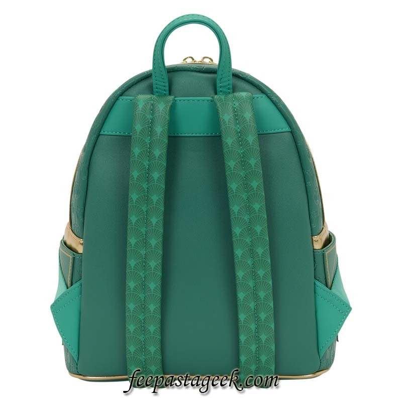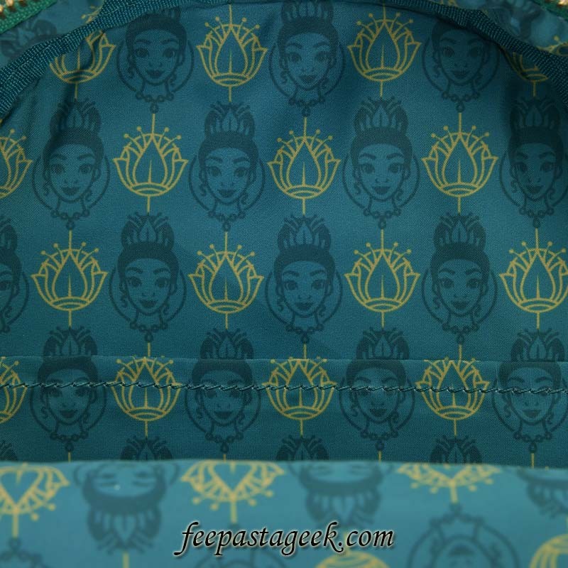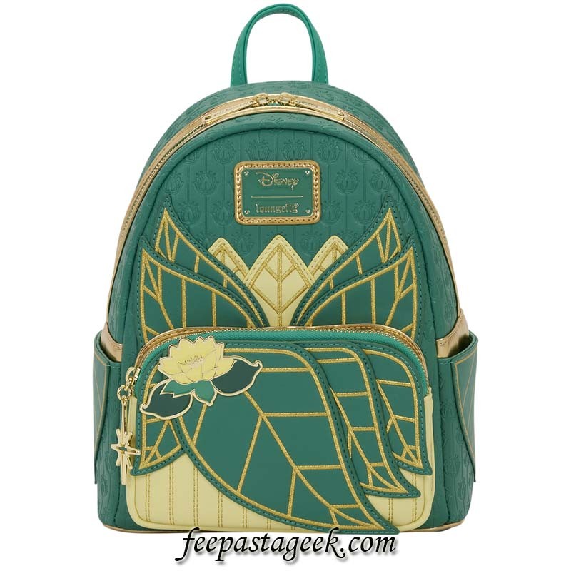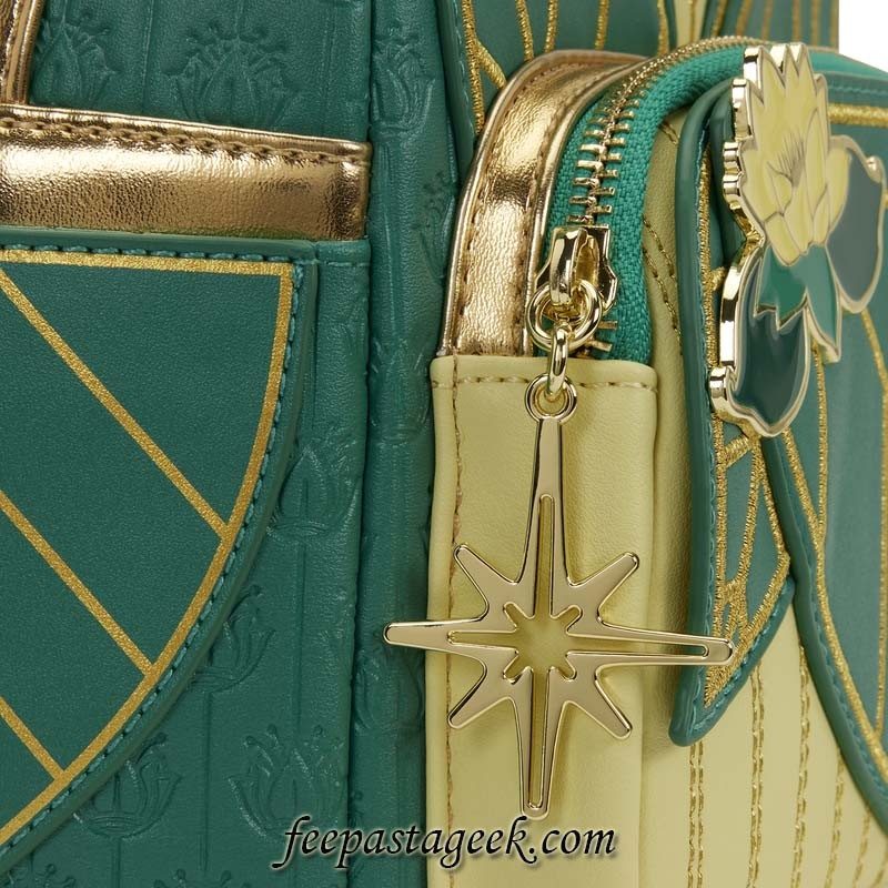 Ce mini sac à dos s'inspire de la robe verte de la princesse Tiana. Il est orné de broderies dorées métalliques, de rivets émaillés et de détails en relief. Des feuilles décorent les poches latérales, et d'autres détails en relief apparaissent sur les bretelles. À l'intérieur, vous trouverez une jolie doublure représentant Tiana, qui s'harmonise à merveille avec le reste du sac !